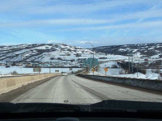 小雪が降っているが、風や車の風圧で路面の粉雪は吹き飛ばされていく。安全運転でひたすら南下していく。大平原が続いたが、Peace River(ピース・リバー)の町のところで、川に沿った大きな谷を橋で渡った。