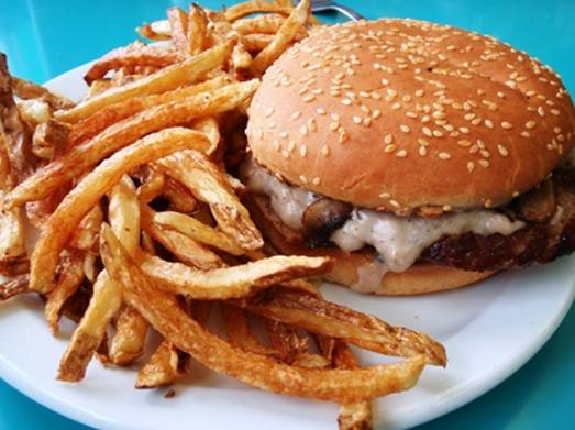 ピース・リバーはスルーして、14時過ぎにValleyview(バレービュー)という小さな町のSammy’sレストランに入った。7日目にグリムショウで食べたとこと同じチェーン店のようだ。ハンバーガーやサラダなどを食べたが、やはり食べたことがないようなオリジナルなメニューであって満足できた。写真はきのこのグラタンソースが入ったハンバーガ。