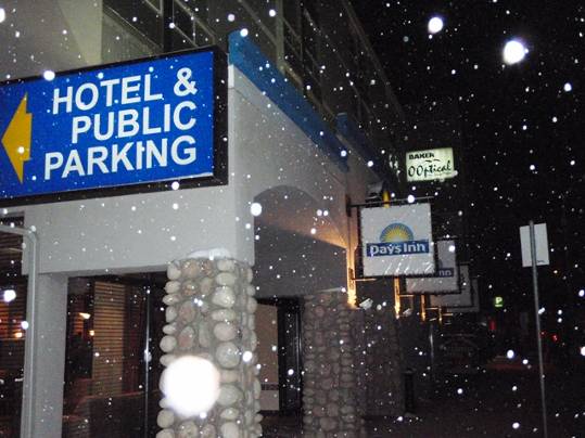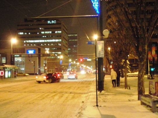 エドモントンが近づいてくると、次第に大きな町を次々と通り過ぎるようになってくる。辺りはだいぶ暗くなってきて、夜の都会の明かりが目立つ様になってきた。ようやくエドモントンの市街に入った。街には碁盤の目ように南北に道路が走っている。小雪は降り続いており、メイン道路は除雪が完璧だが、細い路地などでは真っ白な路面になっている。街が広すぎて、細かい所まで除雪できないのだろう。信号などで止まるとき、除雪されていない所ではABSが作動することもあった。