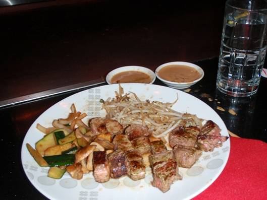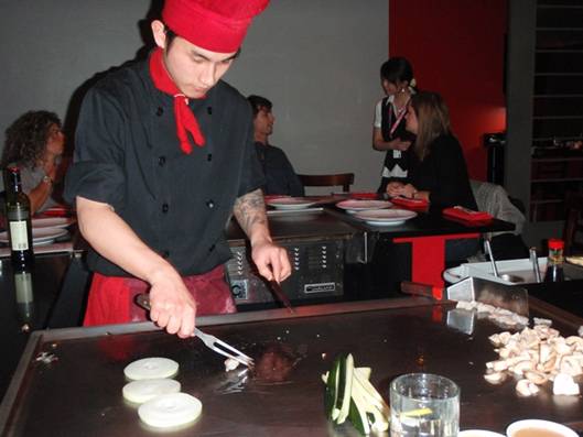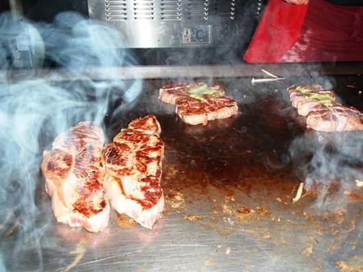Steakを2つ注文。どちらもAAAのランクのついた最上級のアルバータ産牛肉だ。座ったテーブルの目の前には大きな鉄板がある。ここで、腕に刺青のあるシェフが鉄板の前に登場。最初に肉の焼き方について尋ねられた。僕たちが日本人だとわかると、日本人のスタッフを連れてきてくれ、説明をしてくれた。説明が終わると、まずスープとサラダにライスが出された。シェフは最初にナイフを両手に持ち、鉄板の上で打ち鳴らしたり、ジャグリングのように器用に舞わす高度なパフォーマンスを披露。そして、パフォーマンスは続けながら、華麗に、オニオン、ズッキーニ、マッシュルーム、エビを焼き始める。ナイフで切っていくのもパフォーマンス。いい感じに火が通ったら、4人の皿の上に盛り分けてくれる。エビがぷりぷりで最高にウマい。次に、大きなサーロイン(New York Steak)、テンダーロイン(Tenderloin Steak)を鉄板に乗せ焼き始めた。その間にシェフは、もやしも鉄板上でバターを使い、炒め始める。両手のナイフを器用に使い、鮮やかに炒めていく。もやしでハートマークも作ってみせた。肉のほうは表面にいい焼き色が付いてきた。ここでグリーンバターという緑色のバターを肉に乗せ、サイコロ状に斬っていく。ミディアムに焼きあがったステーキがお皿の上へやってきた。サーロインは口に入れると、コクのある脂がじゅわーっと広がり、とろけてしまうような味わい。テンダーロイン(ヒレ肉)は肉の繊維があっという間にほぐれてしまうほど非常にやわらかい。どちらも最高の一言に尽きる。しかも肉のタレがいい。自家製のゴマダレで、濃厚なコクが肉ととてもマッチする。タレをご飯の上にかけただけでもご飯がすすむ。コースの最後は、デザートのアイスクリームで締められた。肉はもちろん、その他の野菜やスープなども非常においしく、価格は4人で約$120+Tipだが、これほどボリューム満点のステーキコースとシェフのパフォーマンスが見られて、この値段はとってもお得だと思う。さらに食後には、先ほどの日本人女性スタッフの人と、これまでの旅についてなどの会話を楽しんだ。この方はカナダにワーキングホリデーで来ていると言っていた。偶然見つけたこのお店は、今合宿の中で間違いなくNo.1と言えるだろう。