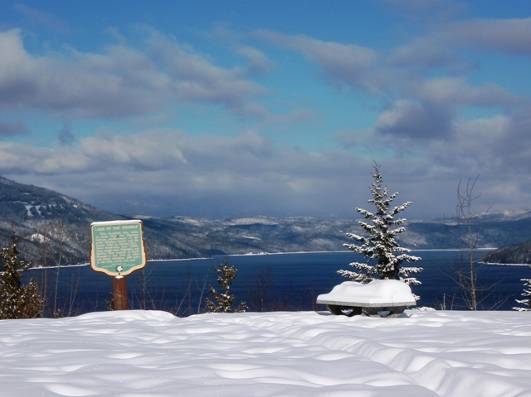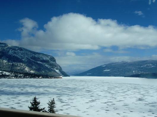気持ちの良いマウンテンロードを通過して行き、次の見所は、Salmon Arm(サーモンアーム)の町周辺を取り囲む巨大な湖、Shuswap(シュスワップ)湖。この湖は、凍結している所と、していない所が混在していた。完全凍結した真っ白の湖は、これまでにもたくさん見てきたが、白い雪山に取り囲まれた、宝石のような青い湖水の湖はカナダで始めて見た。