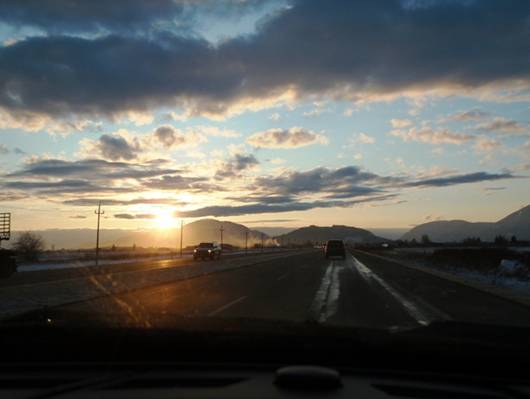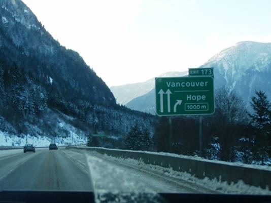 カムループスからはイエローヘッドハイウェイ5号線を南へ進む。分離帯つきで走りやすい道路だが、追突事故を起こした車を2回ほど見た。バンクーバーまで気は抜けない。しばらく沿線に街は少なく、給油できる所も限られる。Hope(ホープ)という街で給油のためにハイウェイを一旦降りることに。車のタイヤ周りには、泥にまみれた雪の大きな塊が張り付いていた。給油のついでに汚れも落とした。