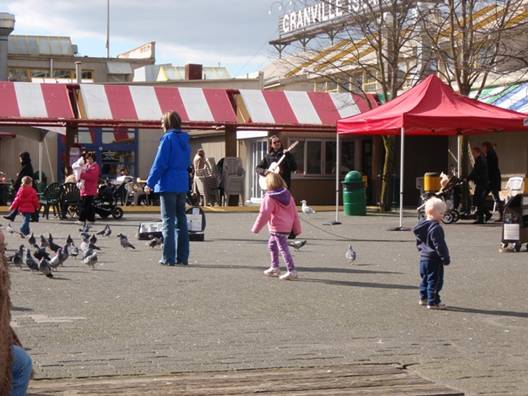 ダウンタウンの南のFalse Creek(フォルス・クリーク)という入り江にある小さな半島には、Granville Island(グランビル・アイランド)という大型ショッピングエリアがある。マーケットやフードコートが立ち並び、観光客だけでなく、地元の人でもにぎわっているようだ。広場にはいろんな種類の鳥がたくさんいて、食べ物を狙っている。パンなどをちぎってあげると、一斉に鳥たちが迫ってくる。