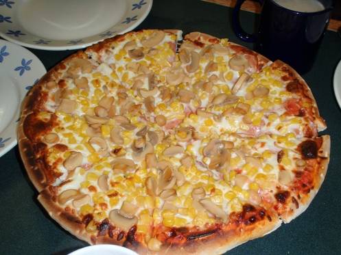 この日は朝からピザ。スーパーで買っておいたチーズとスライスサラミのみが載っているピザ生地に、たっぷりのコーンとマッシュルームを載せてオーブンに。焦げ目が付くまでじっくり焼くと、ご馳走ピザの焼き上がり~。