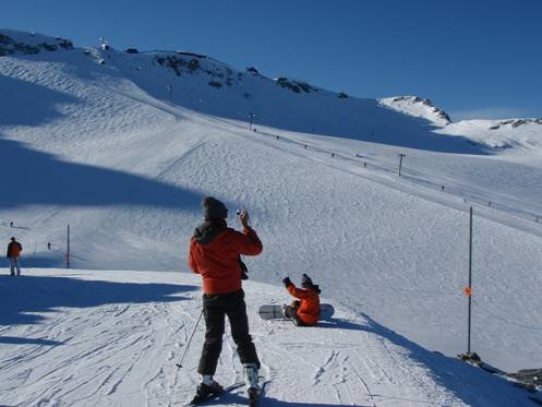 T-Bar”(ショウケースTバー)というリフトに乗って行ける。変わったリフトで、T字を逆さにしたようなバーがケーブルからぶらさがっており、このバーに2人で腰掛け、つかまることで斜面を滑り上がっていく。スキーやボードの板は雪面に付いたままである。初めて乗る者にとってはこれがなかなか難しい。篠田と堀部は2回もリフトから転げ落ちた。