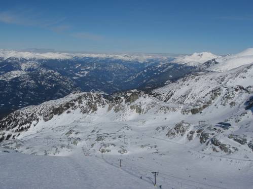 車に乗ってウィスラーへ。今日も快晴!ゴンドラ乗り場まで行くと、明らかに昨日より人が多いことが分かる。土曜日だからであろう。今日は一日ブラッコム山で滑走する。まずはBlackcom Excalibur Gondola(ブラッコム・エクスカリバーゴンドラ)に乗る。ブラッコム山はウィスラー山に比べ、急斜面が多く、コブ付き斜面も多くなっている。中腹には中級・上級のコース数が非常に多く、スピードの出る急斜面コースや、コブだらけのモーグルコースなど、それぞれ様子が違っており、楽しい。ジャンプ台や巨大なハーフパイプ等が作られているパークコースも、難易度別で数種類ある。 Glacier(氷河)Exp.というクワッドリフトに乗ると、一気に森林限界を超えた白銀エリアへと出る。ゲレンデはやはり広大だ。リフト待ちの列が長く伸びるほど人は多いが、コースを滑っていて、他の人とぶつかりそうになるというような窮屈感はなく、自由に好きな所を滑れるという開放感が気持ちいい。