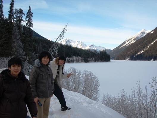 スコーミッシュから99号線をひたすら北上。ウィスラーも通過。朝日を浴びた雪山が美しい。ここからは始めての道となる。Penberton(ペンバートン)という牧場の多い集落を過ぎると、道幅は狭く、路面は悪くなり、くねくねの山道となった。川には氷が張り、雪が積もって真っ白になっている。それでも道路の除雪だけはしっかりとしてある。しかし道路には”Avalanche Area”(雪崩地区)と書かれた標識があちこちに立っており、今にも落石が起きそうな斜面が、何の落石対策もされずに道路脇にそびえ立っている。こんな大自然の山の中を走っていくと完全に凍りついた美しい湖が。周りの霧氷もすばらしい。ここで写真休憩。気温は-15度を示している。