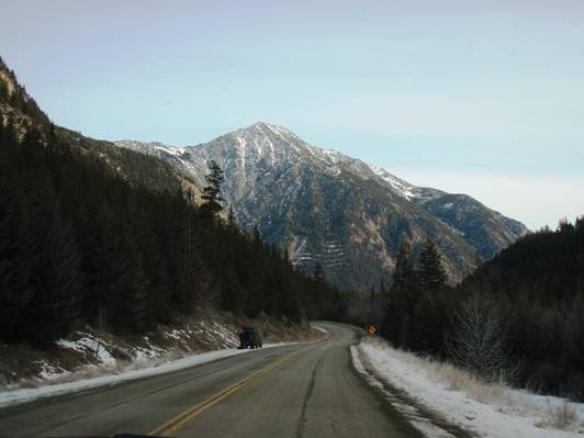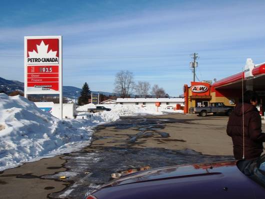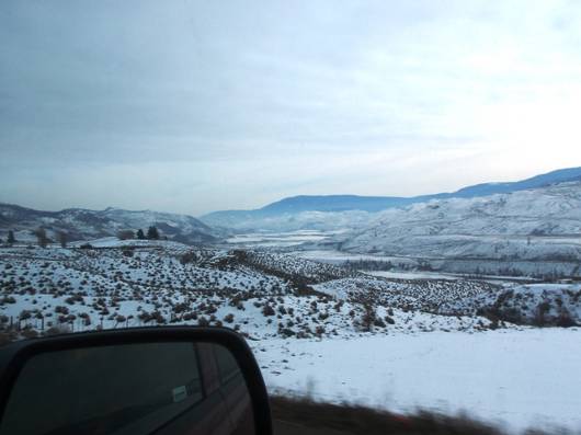 ヘアピンカーブもあった厳しい山道を下り終えると、Lillooet(リルエット)の街に出る。この辺りでは雪は少なくなってきている。赤茶けた色の岩盤が川に浸食され、大きな深い谷を作っているところがリルエットである。ここからは谷沿いに付いている河岸段丘上のなだらかな丘陵地の道を進む。所々でウシやウマの放牧が行われ、雪に覆われた広大な農場も現れるが、集落の付近に集中している。数十キロも間隔が開いている集落間には、道路以外に人の手の入っていない大自然がずっと広がっている。給油のためCache Creek(キャッシュ・クリーク)という町のスタンドで休憩。カナダのガソリンスタンドには、必ずコンビニエンスストアのような店があり、ガソリン代もこの店のカウンターで支払う。