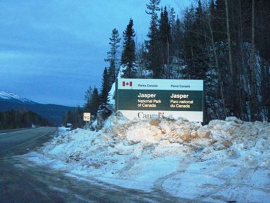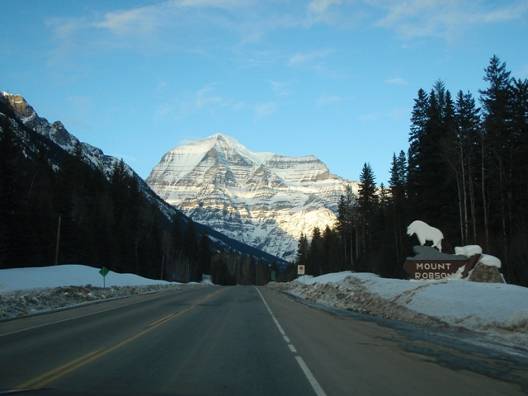 州立公園指定の美しい山並みを見ながら、さらに5号線を進む。しばらく曇っていたが、次第に太陽が顔を見せ、雪山が輝きだした。ひたすら走ることすでにもう夕方。イエローヘッド・ハイウェイは5号線から16号線に移り行く。ここからはMt. Robson(マウント・ロブソン)州立公園。道路の正面には、カナディアンロッキー最高峰、標高3954mのロブソン山が雄雄しくそびえ立っているのが見えてきた。三角形の形をしており、雪と岩の横縞模様が特徴的である。そしていよいよロッキーを越える。長大なロッキー山脈の山越えというからには、険阻な山道を想定していた。しかし、速度制限は90~100km/hのまま。ほぼ平坦な直線がずっと続いていく。おかしいなと思っているころに、イエローヘッド峠を越え、Alberta(アルバータ)州の境界を示す看板が出現。ロッキー越えは拍子抜けするほど楽勝だった。道路上には雪もなく、オールシーズンタイヤで大丈夫かと考えていたのだが。