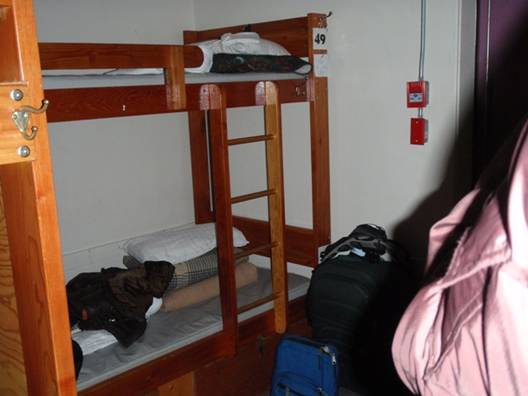 町を出て南に向かい、真っ暗な山道を登っていくと、ようやく宿を発見。チェックイン完了。ユースホステルなので、寝室は大部屋にたくさんの二段ベッドが並べられているだけ。しかもベッドにカーテンすら付いていない。冬季なので、他の客は少なかったが、夏季には人気があり、予約ですぐに埋まるらしい。こんなところではくつろげない上、荷物も心配になる。そんなことで、もう一度ジャスパーの町に行くことに。雪とイルミネーションが彩る小さな町を車でぐるっと回わった。ホテルの数が非常に多い。しかし、夜遅いので、大体の商店はしまっていた。一通りジャスパーの町の雰囲気を楽しんだ後、まだ開いていたコンビニ風の店に入った。お菓子や明日の朝食を買ってから宿へと戻った。