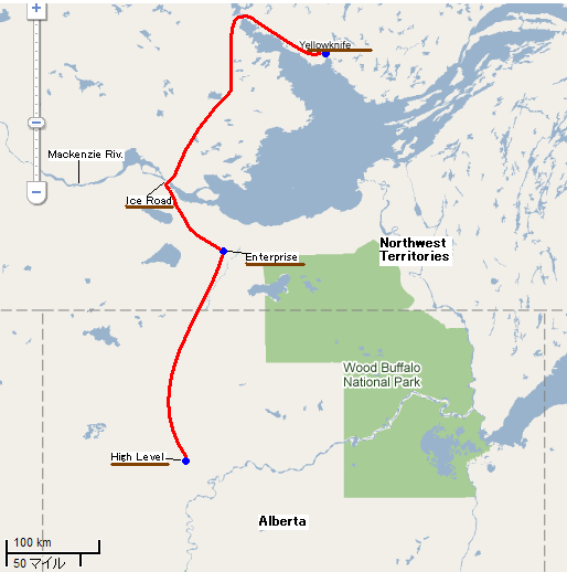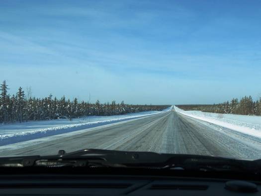 今日の目的地はYellowknife(イエローナイフ)。ハイレベルで北緯58度。イエローナイフは62度。アルバータ州とノースウエスト準州の州境は60度である。ちなみに日本最北端の宗谷岬が45度だ。雪は夜のうちに降り止んだようだが、道路は真っ白になっていてセンターラインは全く見えない。少し心配しつつ、イエローナイフに向けて出発。しかし、タイヤがスリップするような感じは全くない。交通量は少ないものの、対向車が通ると、道路上の雪が舞い上がり、路肩に吹き飛ばされて、自然除雪される。トラックのような大型車が対向すると、舞い上がった大量の雪で視界が真っ白になり、少しの間何も見えなくなるので、かなり怖い思いをする。この辺りは進んでも、進んでも景色はほとんど変わらず、ただ森の中の広く白い一本道をひたすら進むだけとなる。