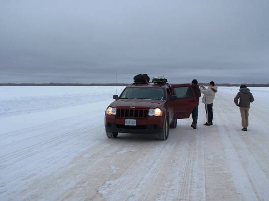 アイスロードに出てみると、左手はマッケンジー川、左手はGreat Slave(グレートスレーブ)湖の一面真っ白な世界となる。ただ、車が通る所の氷面だけが、薄い土色に色付いている。世界で10番目に広いグレートスレーブ湖は、地平線の向こうまで、広がっているようにも見える。そしてなぜかカラスが多い。車の周りにまとわりついてきた。
