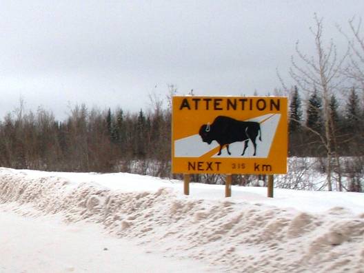 ここからイエローナイフまでは約300km。その間、道沿いの集落は1つもない。携帯も圏外なので、何か起こってしまうと非常に厄介なことになるだろう。そしてこの辺りはバイソン(野牛)警戒区となっているようだ。バイソン注意の標識はたくさん立っている。道の周りの木は背が低くなってきており、たまに見晴らしがいい所も。気温は真昼で-21℃。