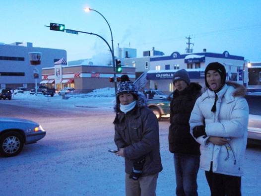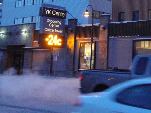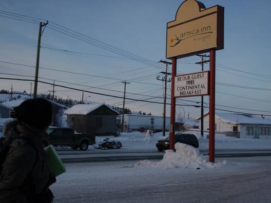 未開の原野から突然建物が現れる。そして一気に道路案内標識が増え始め、イエローナイフの都心部に突入。あっという間の出来事だった。まさに都会といった雰囲気だ。こんな極北の地に高層ビルが建ち並んでいるとは・・・。氷点下20℃の中、街は活気にあふれ、多くの市民が街を歩き回っている。町の中心部を少し過ぎた所にあるモーテル”arnica(アルニカ) inn”にチェックイン。最近リニューアルされた宿で、清潔感があり、居心地のいい部屋である。さらにこの宿も安い。受付の人との英会話が完全には理解できなかったが、調べておいた値段より安く泊まることができた。
