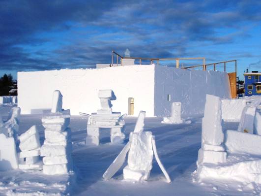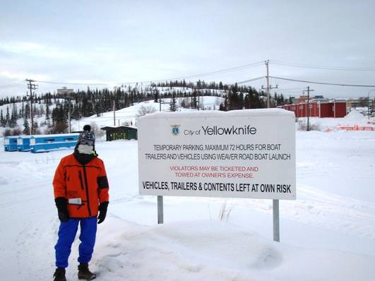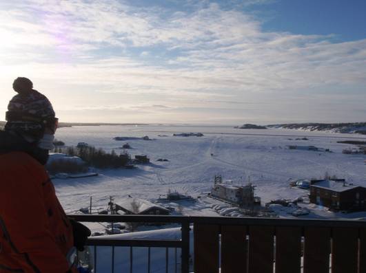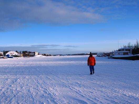 食後は街の散策。寒いのでスキーウェアを着込んでいく。まだ、商店などは閉まっている時間なので、郊外へと向かうことに。ここにもグレートスレーブ湖上のアイスロードがあった。アイスロードを歩いていくと、氷の上に家が建っている。良く見てみると、基部がいかだの様になっていて、周囲にゴムタイヤが取り付けてある。夏は湖の上に家が浮かび、岸に係留されているのだろう。