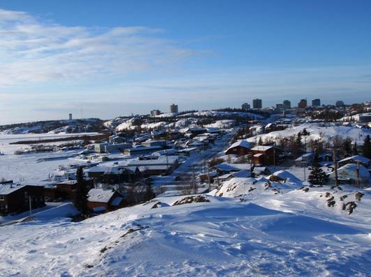 次は少し小高い丘の上へ。モニュメントがあり、イエローナイフの街を眺めるには絶好の場所になっている。アイスロードもはるか遠くまで続いていくのが良く見えた。