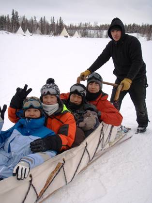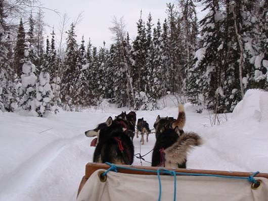 第2便に僕たちが乗り込んだ。引っ張る犬は第1便と同じ犬で、そりの後ろに現地民族の人がコントロールするために乗っている。疲れてはいないのか、犬の力はかなり強い。予想を超えるスピードでそりは進んでいく。段差があると、そりが跳ね上がるほどだ。この勢いがとても楽しい。上り坂では一旦休み、根性で登っていく。一旦止まった時に、おしっこする犬もいた。下り坂では跳ぶように早い。貴重な体験ができた。