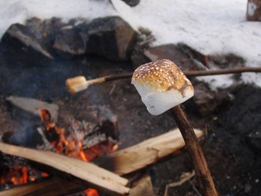犬ぞりの後は、焚き火の所に行き、マシュマロを焼いて食べた。マシュマロを焦がさないよう上手に焼くと、周りがキツネ色になり、外はカリッと、中はとろーっとした食感になり、とってもおいしい。