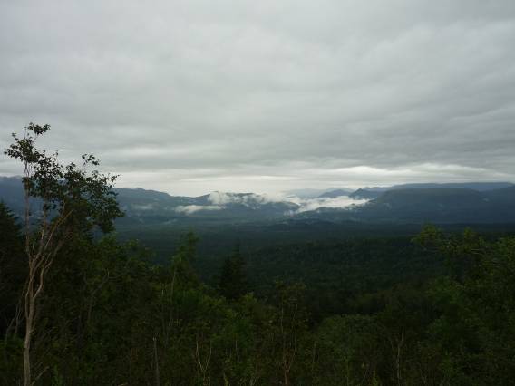 三国峠から眼下に広がる樹海を望む。どこからヒグマが出てきてもおかしくないような道が続いている。雨は強くなる一方で、すこぶる寒い。