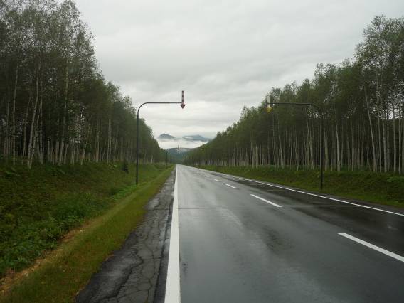 糠平へ続く道。北海道らしい直線道路だ。路面は雨でびしょ濡れ。早くどこかに避難したいが、町が無い。本州ならば、道路わきにたまに猫の死骸が転がっていたりするが、この道ではシカが死んでいた。