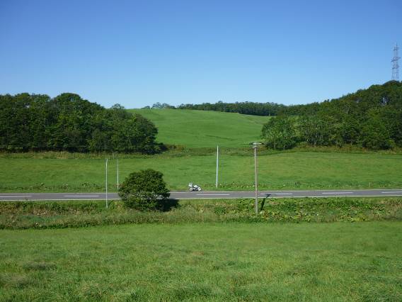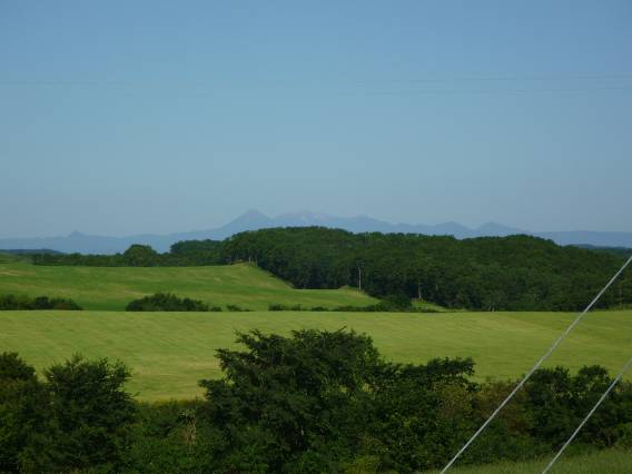 釧路を過ぎ、ミルクロードと呼ばれる国道わきに広がる牧場。遠くには昨日通過した大雪山系も見える。