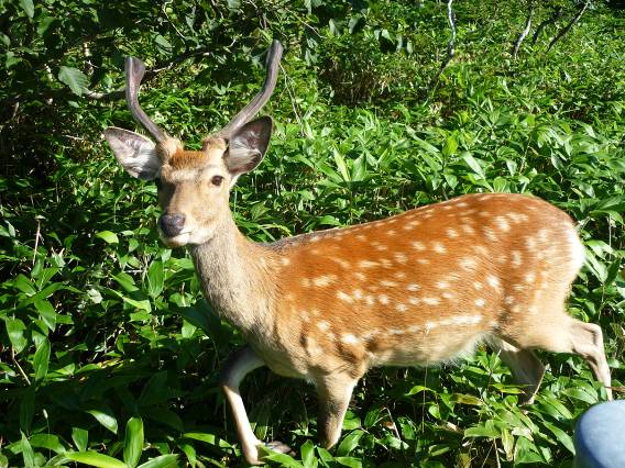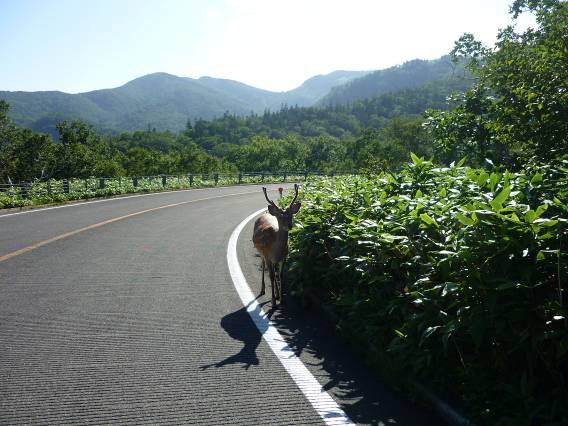知床峠付近でシカが出没!あわててバイクをとめて近寄ってみる。が、逃げない。人間に慣れているのだろうか。警戒心の強いはずのシカが逃げないのは不思議だった。2枚ともズームではない。1mくらいの距離にまで近づくことができた。かわいい。