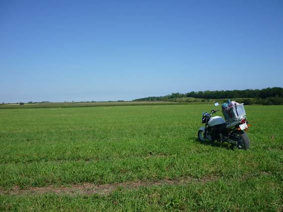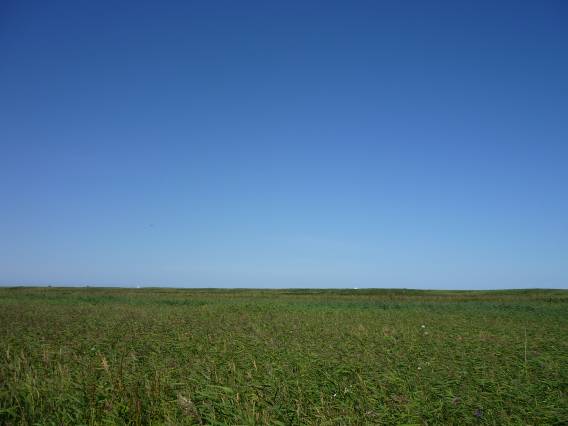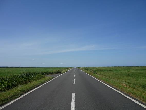 かねてから計画し、憧れだったエサヌカ線。交通量は皆無に等しく、まるで空に道路が溶けていくようだった。両側に広がっているのは原生花園や牧草地である。