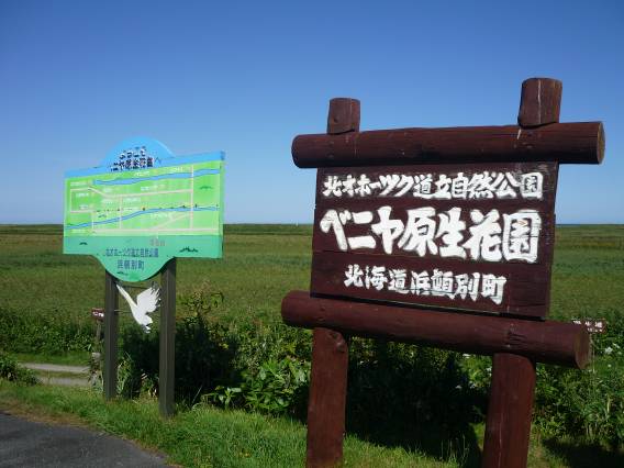 美しいベニヤ原生花園。北海道では北部の海岸はたいてい砂浜海岸の陸側に原生花園が広がっているようだ。花の開花ピークはもう過ぎているようで、少し寂しげな雰囲気が漂っていた。そして途中、クマが出没したとの情報を知らせる看板を発見。もしこんなところで突然出くわしたらもう終わりだ。