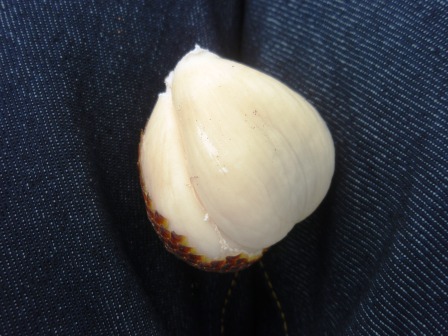 サラッはむいてみるとニンニクのような見た目をしていたが、臭いはきつくなく、たとえようのない味がした。固めの食感で、あまり甘くはない。