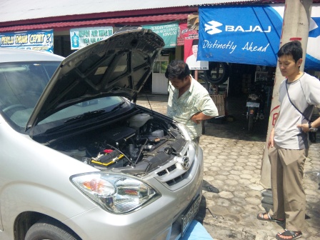 給油中。インドネシアではPertaminaというガソリンスタンドしか見なかった。ガソリンも軽油も同じ価格の45円/L程度。安い!!さすが産油国。スマトラ島でも、プカンバル近郊のミナス油田などでは良質の原油が多く産出されている。